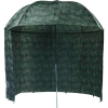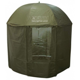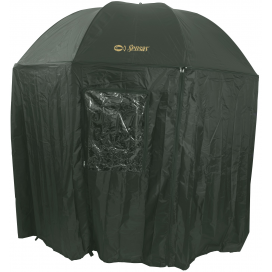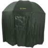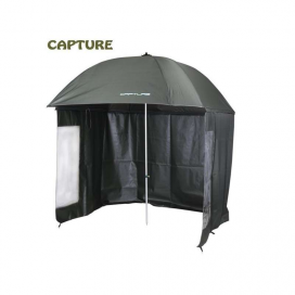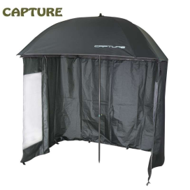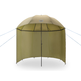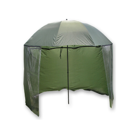 - Rybářský deštník s bočnicemi – Podstatou správné funkce tohoto deštníku je dobré ukotvení bočnic kovovými kolíky. Jste tedy chráněni nejen ze zhora, ale i z boku. Bočnice je upevněna zipem zhruba na 80% obvodu deštníku.