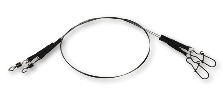 Návazec vyroben z kvalitního nekroutícího se titanového lanka, dvojitě krimpovaný pro zajištění pevnosti, vybavený obratlíkem a karabinkou se zámkem.