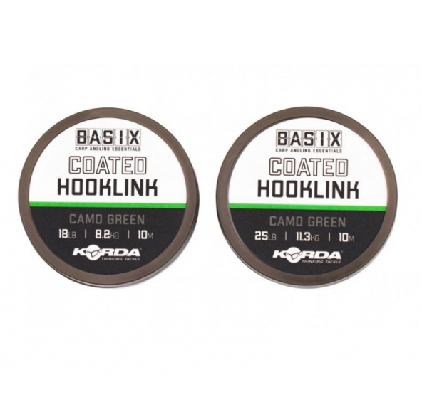 Basix Coated Hooklink je měkká, pružná potažená pletená šňůrka, je vhodná pro nejrůznější způsoby prezentace nástrah. Jak vnitřní část, tak vnější potah je v decentní „kamuflážově zelené“ barvě, díky tomu má skvělé maskovací vlastnosti. Skvěle drží tvar diky čemuž odpadá nutnost napařování, to je také výhodou v tom že se snižuje možnost zamotání, potah lze velmi snadno odstranit dle potřeby a vašeho využití při vázání montáží. Velmi dobře se s ní pracuje i při výrobě koncových uzlů, aniž by hrozilo že porušíte vnější potah, což snižuje riziko poškození vnitřní části a snížení nosnosti šňůrky. Basix Coated Hooklink je k dispozici v nosnostech 18 lb nebo 25 lb a je dodávána v 10 metrovém návinu.
