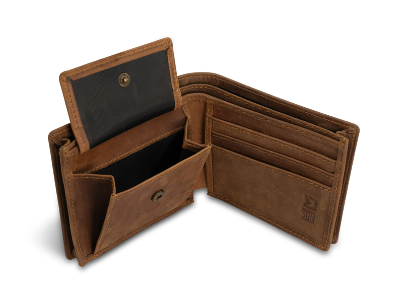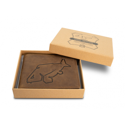 Stylová kožená peněženka s originálním motivem kapra, která bezpečně uchová vaše doklady i hotovost. Obsahuje několik přihrádek na platební a zákaznické karty, zapínací kapsu určenou pro mince, případně žetony a samozřejmě nechybí dvě přihrádky pro uložení bankovek. Peněženka je vyrobena z pravé kůže tmavě hnědé barvy, díky čemuž se vyznačuje kvalitou, odolností a příjemně se drží v ruce.