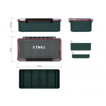 Delphin TBX Case Clip Ideal rozšiřuje nabídku boxů a krabic o praktický model, který se skvěle hodí pro uschování bižuterie, krmítek, zátěží a mnoho dalšího rybářského příslušenství nezbytného při lovu. Díky kompaktním rozměrům ji snadno uložíte do většiny tašek nebo batohů spolu s ostatním vybavením. Je vyrobena z odolného tvrzeného plastu, který spolehlivě chrání obsah i samotnou krabici před nechtěným mechanickým poškozením. Uvnitř se nachází odnímatelná polička, která rozděluje box na dvě části. Polička je rozdělena až pěti odnímatelnými přepážkami, díky kterým si vnitřní uspořádání přizpůsobíte přesně podle svých potřeb. Hlavní úložný prostor je rozdělen dvěma odnímatelnými přepážkami. Pokud se rozhodnete tyto přepážky vyjmout, vytvoříte si ještě větší prostor pro odložení vašeho rybářského příslušenství. Transparentní víko umožňuje mít vždy dokonalý přehled o obsahu, zatímco gumové těsnění po celém obvodu a pevný plastový klip zaručují bezpečné uzavření i během transportu. Díky gumovému těsnění je krabice vodotěsná. Technické parametry: Rozměr: 235x120x65mm Počet odnímatelných přepážek: 7 Rozměr přihrádky: 4X (83X37mm), 2X (83X11mm), 2X ( 96X45mm), 1X(96X96mm) Rozměr vrchní poličky (bez přepážek): 83X183mm Hlavní úložný prostor (bez přepážek): 96X197mm Počet vkladatelných poliček: 1