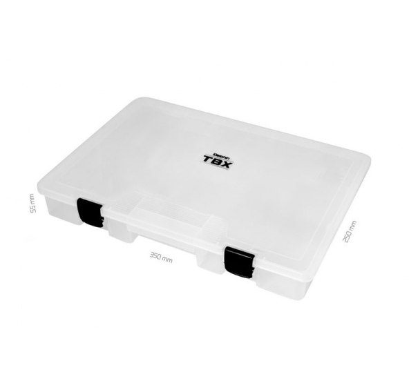 TBX ONE Clip je rada multifunkčných krabičiek určených na uloženie rybárskeho príslušenstva. Vyrobená je z transparentného plastu, takže máte vždy prehľad o uložených veciach vo vnútri krabičky. Vybavená je praktickými externými klipmi z plastu. Technické parametre: Rozmer: 350x250x38mm Počet pevných priehradiek: 8 Rozmer priehradky: 1x(33x3x3,2cm) 7x(4,5x18x3,2cm) Počet vkladateľných priečinkov: 12