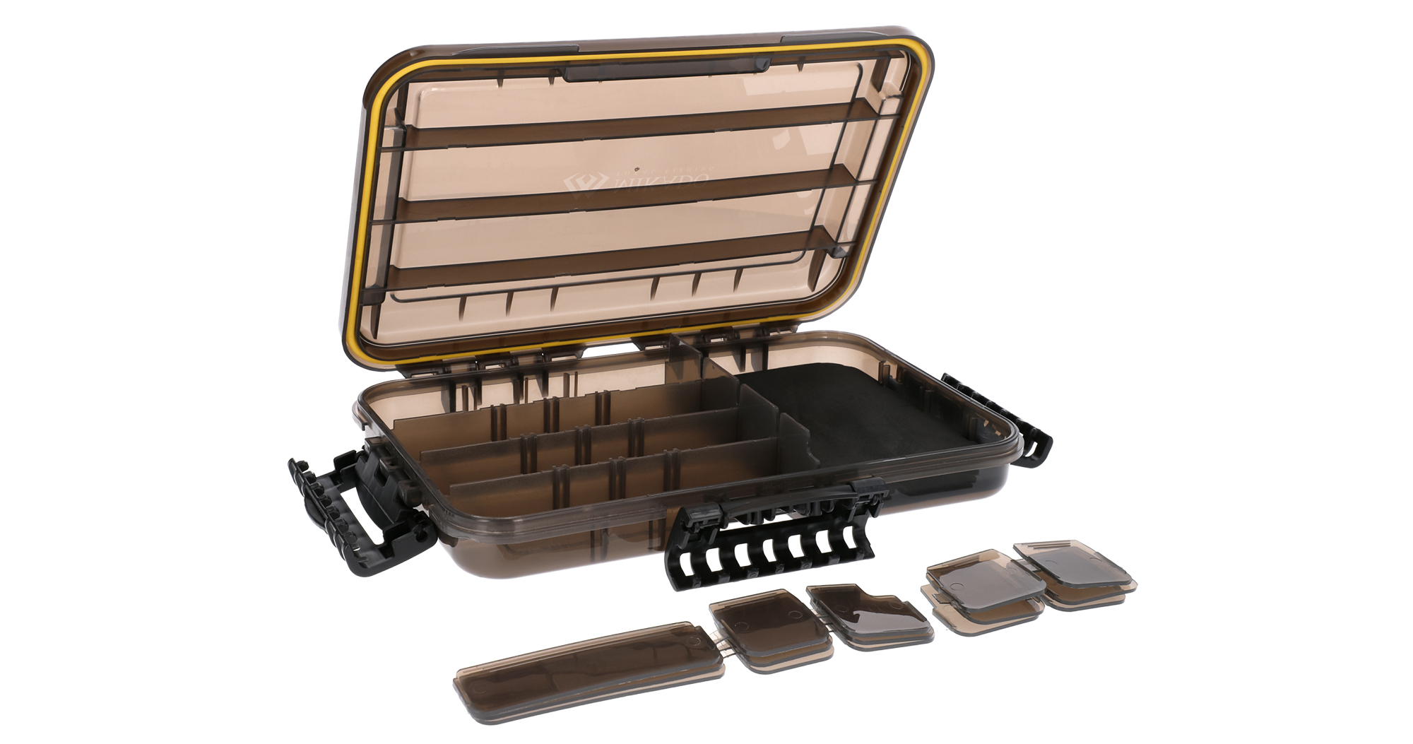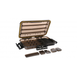 Jednostranné, 100% vodotěsné, černé rybářské krabičky s těsněními. Dolní oddíly byly vybaveny speciálně vyříznutou pěnou. Mají také klasické nastavitelné přihrádky bez pěny pro uložení nejrůznějších nástrah.