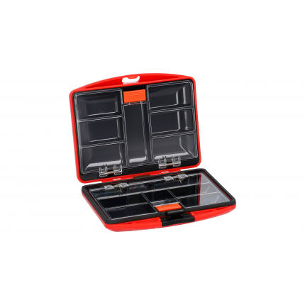 Velmi praktická oboustranná krabička na příslušenství, vyrobená ze silného plastu s pevnými přihrádkami. Průhledné provedení umožňuje snadné vyhledání potřebných drobností, nastavitelné přihrádky umožňují individuální uspořádání.