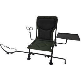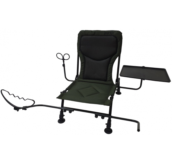 Křeslo pro lov na feeder s příslušenstvím. Čtyři plně nastavitelné nohy s možností uchycení příslušenství, dva nastavitelné držáky na prut, malý stoleček na odkládání nástrah a drobností, držák na vezírek.