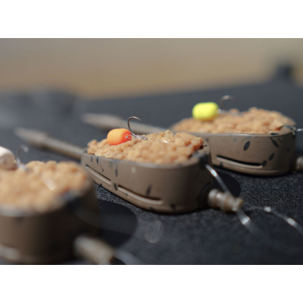 Unikátní krmítko Inline Embed se vyznačuje měkkou gumovou drážkou pro vlasec, ktery zachovává délku háčku a zajišťuje, že zůstane po celou dobu na svém místě a nabídne vám perfektní prezentaci návnady. Integrovaná spona vám umožňuje nastavit délku vlasce s háčkem a směr hrotu háčku a snadno se uvolní ze sevření, když je ryba chycena. Každé krmítko je plněno zepředu, aby byla zajištěna maximální vzdálenost a přesnost náhozu, a je vybaveno chytře navrženou šikmou základnou, která vytváří menší výtlak vody, když krmítko dosedne na hladinu vody. Tato nakloněná základna nejen chrání návnadu v krmítku před uvolněním a vypadnutím při dopadu při nahazování, ale také vytváří méně hluku při dopadu, což vytváří nerušivý zvuk při vstupu do vody. Dalším chytrým designem jsou spodní otvory na krmítku, protože nejsou pouze zúžené, aby zajistily pomalejší uvolňování návnady, ale jsou natočeny v opačném směru, než je směr, ve kterém krmítko dopadá, čímž opět chrání návnadu uvnitř při vstupu do vody. Každé krmítko má také vyměnitelný design, takže krmítka lze rychle měnit, aniž by bylo nutné návazec rozebírat. Specifikace: - bezolovnaté - hmotnost: 24 g