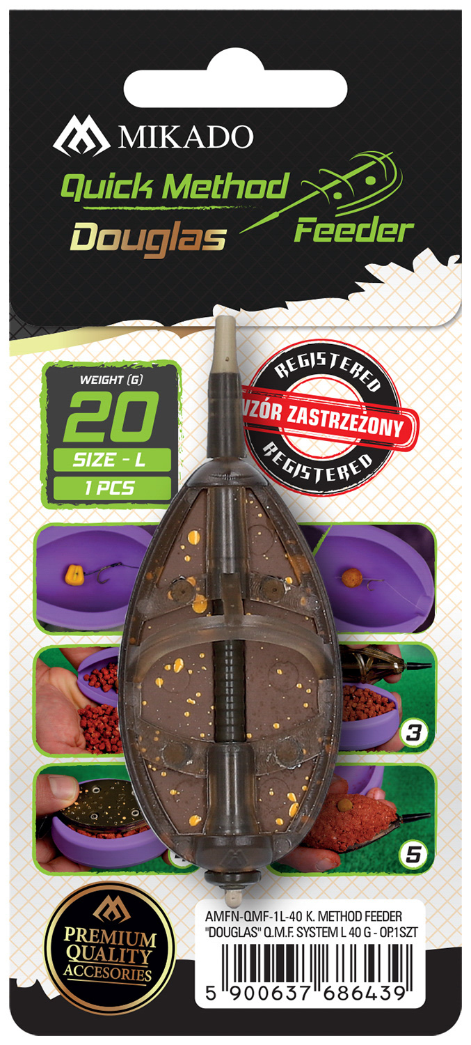 Nová verze krmítek Douglas Method Feeders. Systém Q.M.F. umožňuje rychlou a snadnou výměnu krmítka bez přezbrojování celé udice. Stačí odstranit gumovou převlečku, vyjmout krmítko z trnu a vyměnit za jiné.