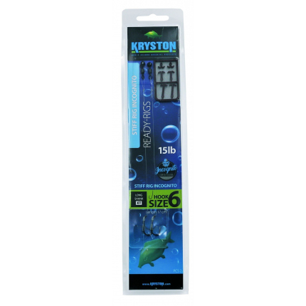 Stiff rig Incognito je univerzální návazec pro nástrahy na dno nebo neutrálně vyvážené. Je na něj použit japonský Extra Long Shank XT háček a 17cm dlouhý 100% fluorocarbon Incognito, který je ve vodě téměř neviditelný a zároveň díky své tuhosti výrazně snižuje riziko zamotání. Vlasový přívěs je uchycen pomocí čiré silikonové hadičky. Balení kromě 2ks návazců obsahuje i 3x 2ks různě dlouhých prodlužovacích vlasových zarážek. Hotové návazce Kryston jsou z prvotřídních komponentů, špičkových japonských háčků a zejména legendárních Kryston šňůrek a fluorocarbonů.