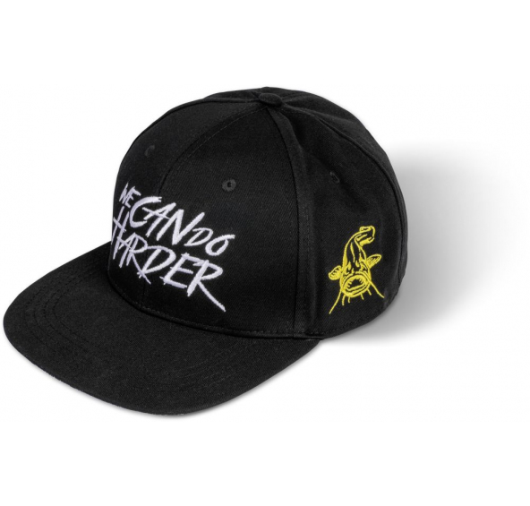 Černá kšiltovka s logem Black Cat a nápisem "We can do harder". Poskytuje ochranu před deštěm a sluncem u vody, ale je také doplňkem pro běžné nošení.