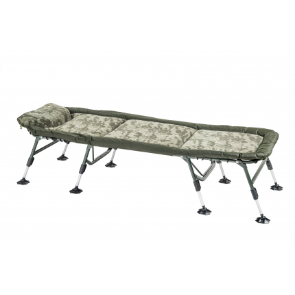 Extrémně lehké, velké a 100% ploché lehátko ve velice atraktivním designu s digitálním maskováním. Nadstandardně silná a velmi komfortní matrace s fleecovou vrchní vrstvou nabízí nejúčinnější systém regulace tuhosti pomocí elastického šněrování na spodní straně. Další výhodou jsou nohy s rozměrnými výkyvnými patkami a možností velkého vysunutí. Lehátko je dostupné ve variantě s osmi nebo se šesti nohami....