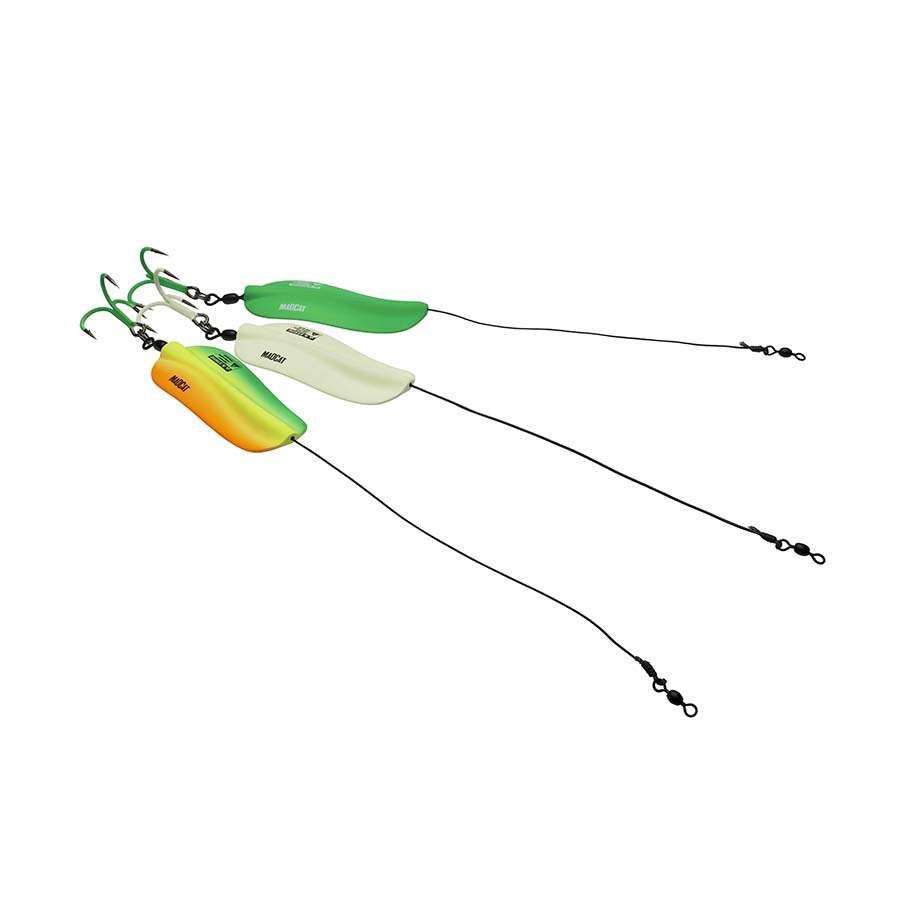 Odolné sumcové inline třpytky vhodné pro daleké nahazování. Výhodou inline konstrukce je to, že sumec nemůže využít lopatku jako páku pro uvolnění nástrahy, protože třpytka jednoduše sjede dál od trojháčku. Velikost trojháčku: 3/0. Speciální antistatický gumový potah minimalizuje elektrické pole, které plaší sumce. Upozornění: Antistatický gumový potah se může vlivem používání opotřebovat.