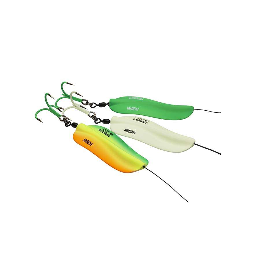Odolné sumcové inline třpytky vhodné pro daleké nahazování. Výhodou inline konstrukce je to, že sumec nemůže využít lopatku jako páku pro uvolnění nástrahy, protože třpytka jednoduše sjede dál od trojháčku. Velikost trojháčku: 3/0. Speciální antistatický gumový potah minimalizuje elektrické pole, které plaší sumce. Upozornění: Antistatický gumový potah se může vlivem používání opotřebovat.