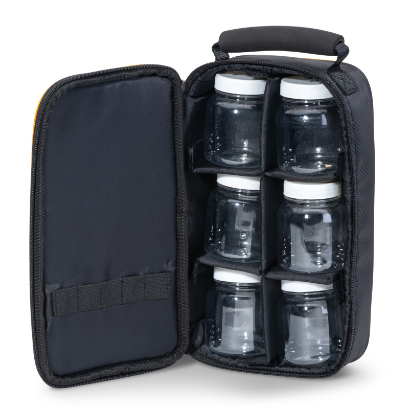 Jednoduché pouzdro s obvodovým zipem a šesti libovolně nastavitelnými přihrádkami. Ty se nastavují pomocí suchého zipu. V ceně je také šest plastových skleniček.
