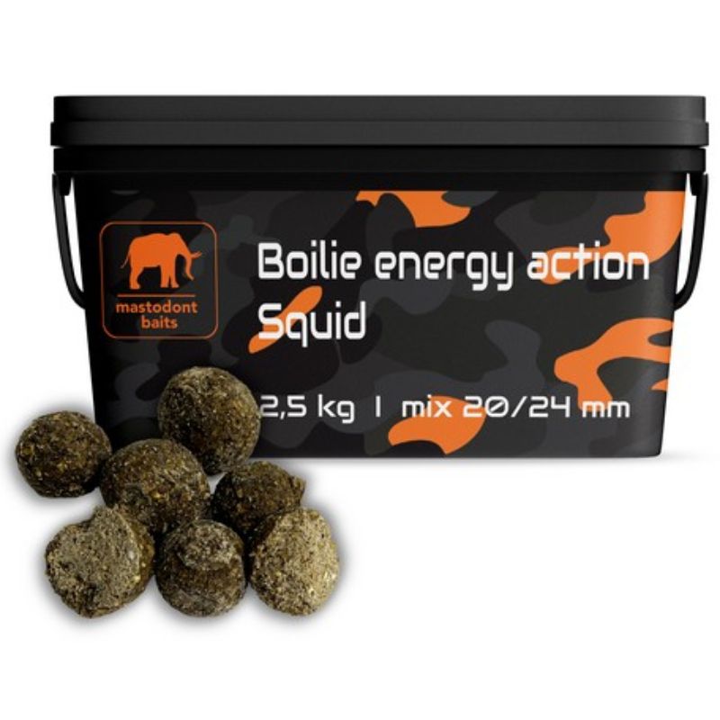 Boilies energy action Squid je slané příchutě, obsahuje velký podíl vysoce energetických surovin, ale i dostatek živočišných a rostlinných proteinů na to, aby ryba neztratila zájem o krmné místo. Kuličky jsou lehce stravitelné, mají hrubší strukturu s dobou rozpadu cca 8-12 hodin při dosušení od nás z výroby, standardní teplotě vody okolo 20°C a normální aktivitě bílé ryby. Všechny tyto vlastnosti doplněné o kvalitní mix esencí kde dominuje oliheň dělají z těchto boilies velice zajímavý produkt za super cenu, u kterého máte jistotu, že je postavený z prvotřídních surovin a obsahuje vše co má: uhlohydráty, extrudované rostlinné moučky, enzymaticky upravenou rybí moučku, vejce, albumin, aminokyseliny a mnoho dalšího.