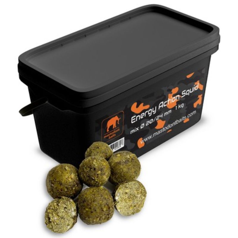 Boilies energy action Squid je slané příchutě, obsahuje velký podíl vysoce energetických surovin, ale i dostatek živočišných a rostlinných proteinů na to, aby ryba neztratila zájem o krmné místo. Kuličky jsou lehce stravitelné, mají hrubší strukturu s dobou rozpadu cca 8-12 hodin při dosušení od nás z výroby, standardní teplotě vody okolo 20°C a normální aktivitě bílé ryby. Všechny tyto vlastnosti doplněné o kvalitní mix esencí kde dominuje oliheň dělají z těchto boilies velice zajímavý produkt za super cenu, u kterého máte jistotu, že je postavený z prvotřídních surovin a obsahuje vše co má: uhlohydráty, extrudované rostlinné moučky, enzymaticky upravenou rybí moučku, vejce, albumin, aminokyseliny a mnoho dalšího.