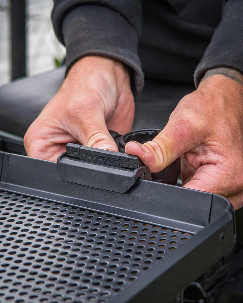 Perfektní druhý odkládací stolek. Lze umístit k zádní straně sedačky. Dodáván se dvěma pohyblivými svorkami na nohy. Sklápí se středem pro kompaktní skladování a přepravu. Vyrobené s použitím naší extra pevné obvodové výztuhy. Pro všechno naše „clip on“ příslušenství. Perforovaný povrch brání hromadění vody a návnad. Kompatibilní s nohami o průměru...