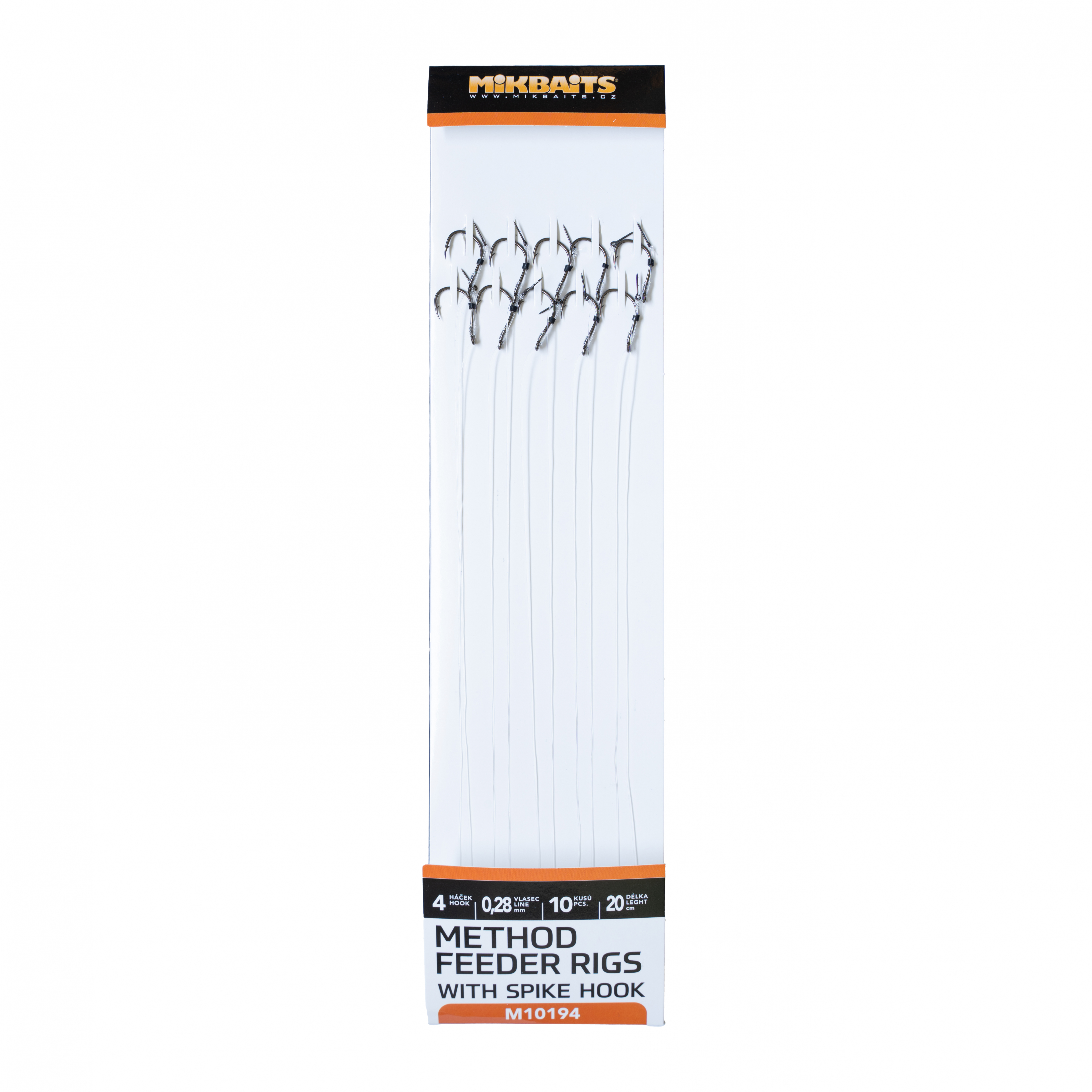 Method feeder návazce se zapichovacím hrotem jsou určené pro malé Pop-up, Wafters, Mini boilie či plovoucí i potápivou kukuřici. K výrobě jsme použili japonské feeder háčky a fluorocarbon o délce 20cm.