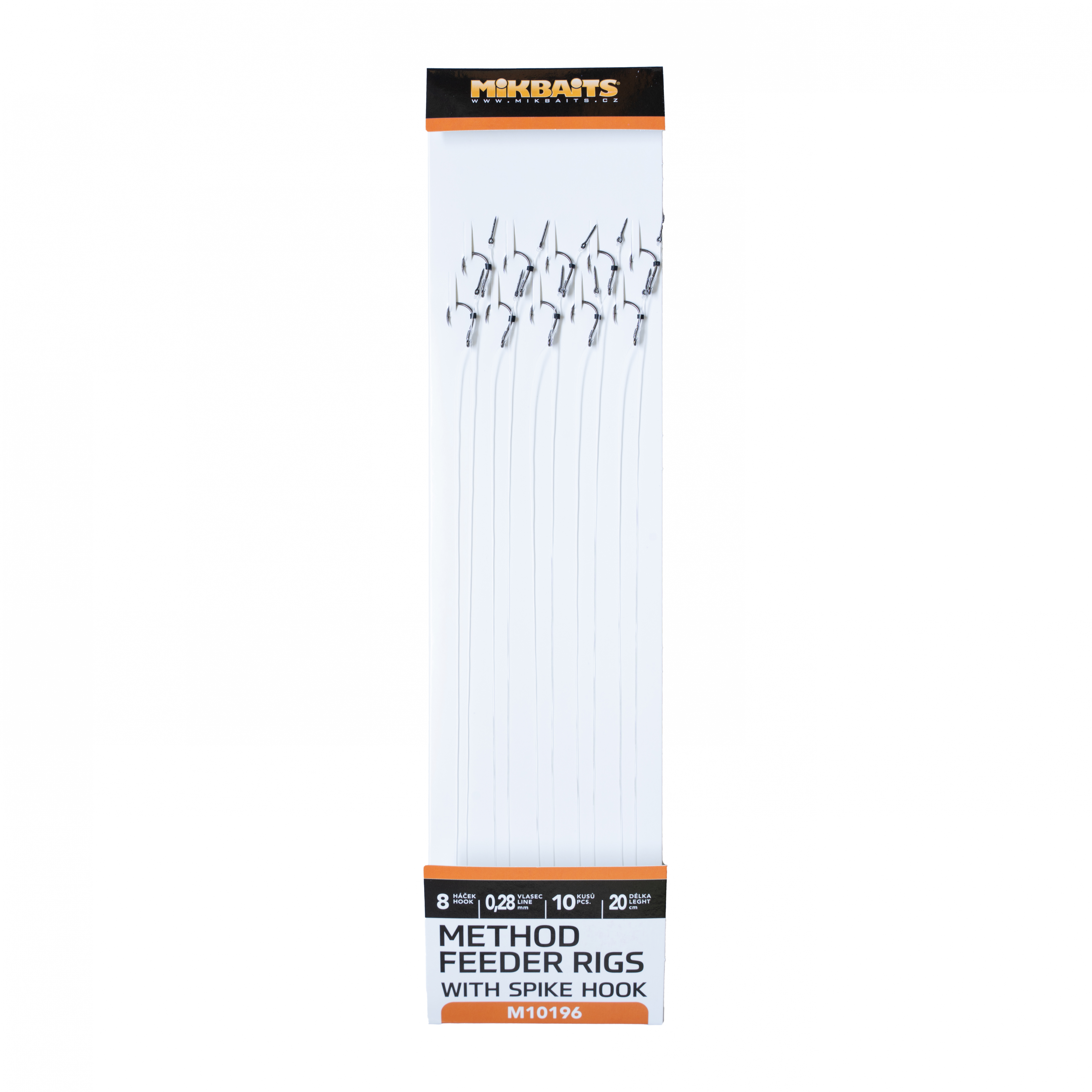 Method feeder návazce se zapichovacím hrotem jsou určené pro malé Pop-up, Wafters, Mini boilie či plovoucí i potápivou kukuřici. K výrobě jsme použili japonské feeder háčky a fluorocarbon o délce 20cm.