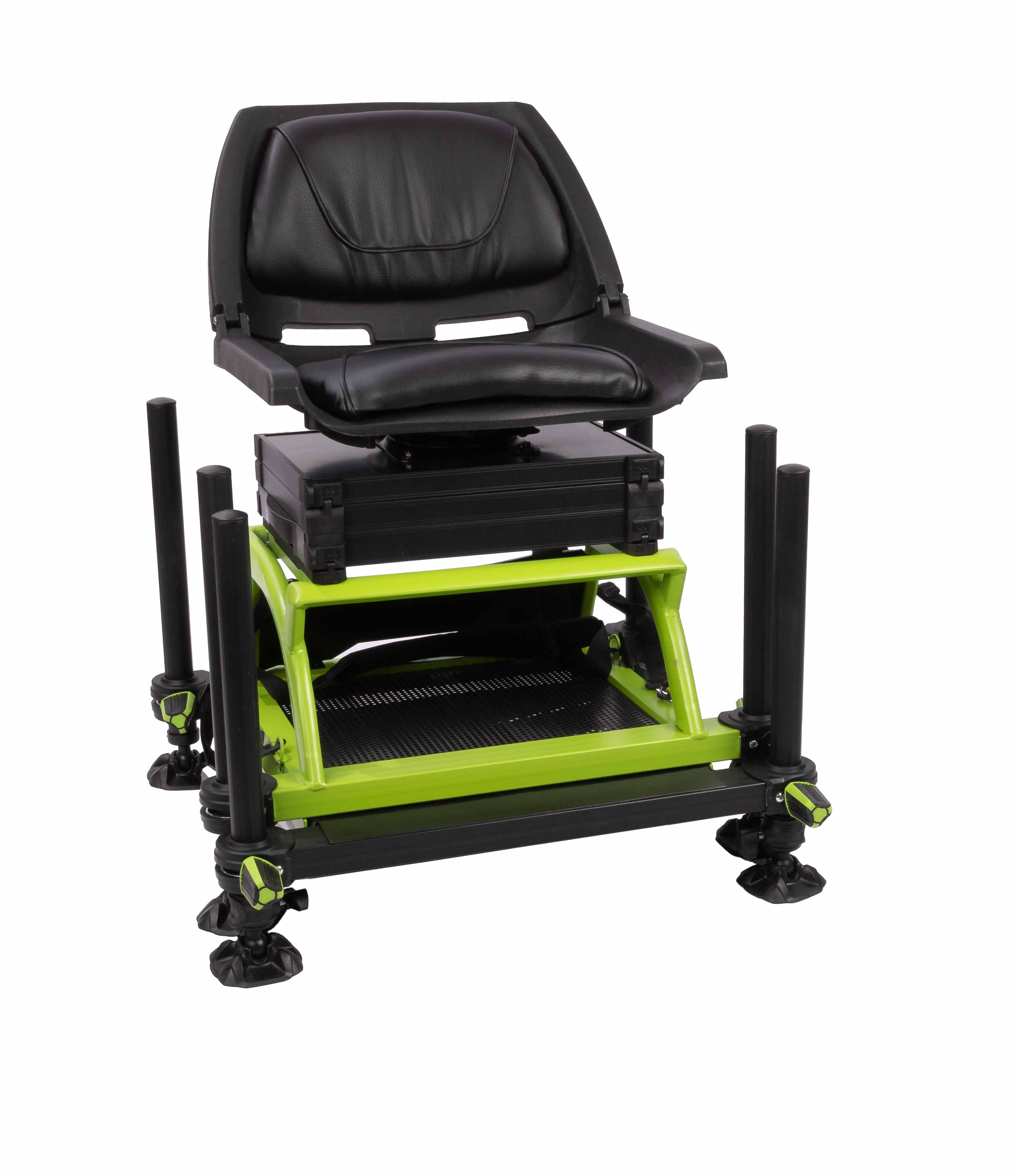 Závodní bedna MX36 Pro s maximální stabilitou a možností přizpůsobení. Boční šuplíky, závity v nohách D36 a prostorná police pod otočným sedákem na krmení či výbavu.