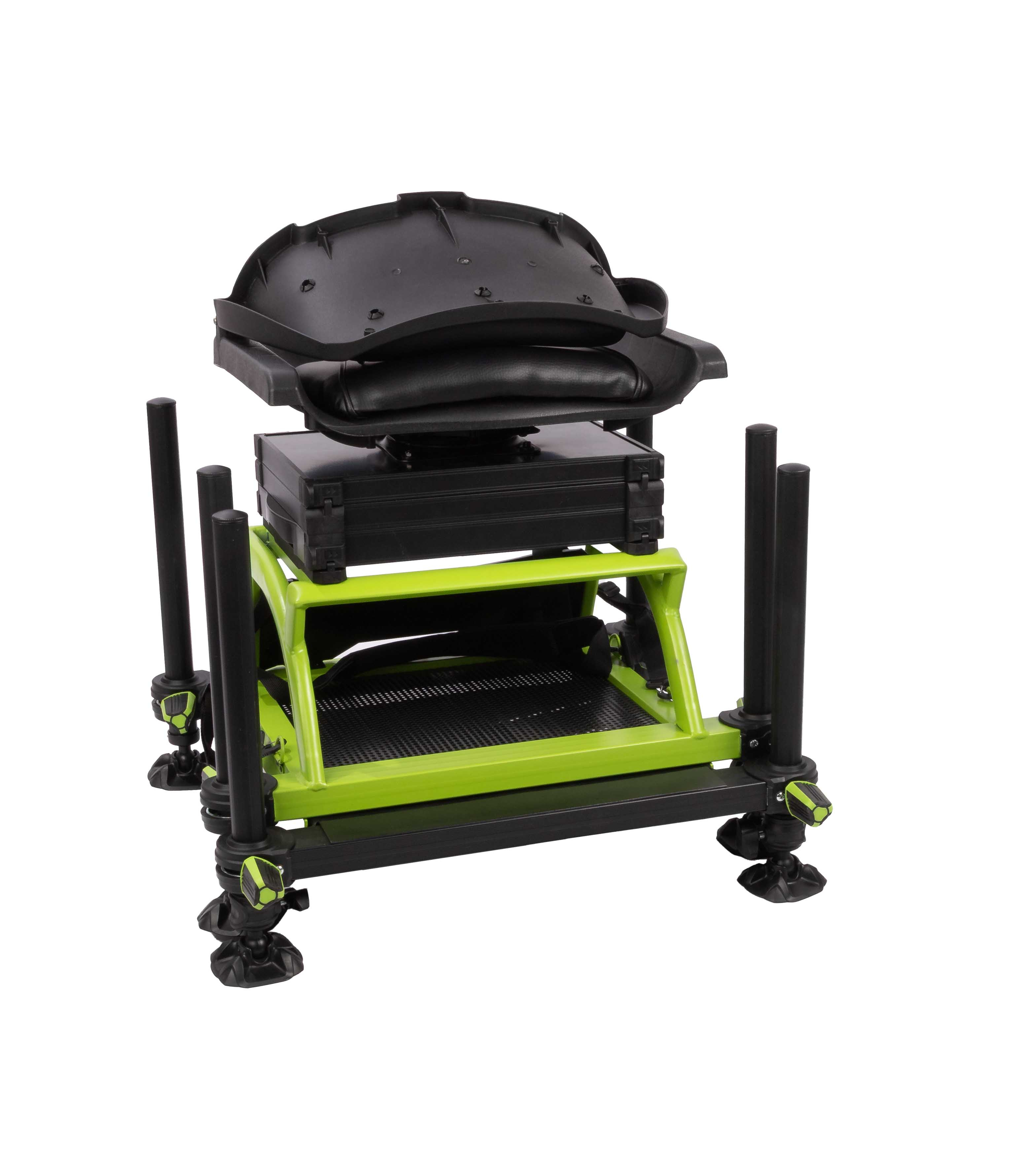 Závodní bedna MX36 Pro s maximální stabilitou a možností přizpůsobení. Boční šuplíky, závity v nohách D36 a prostorná police pod otočným sedákem na krmení či výbavu....