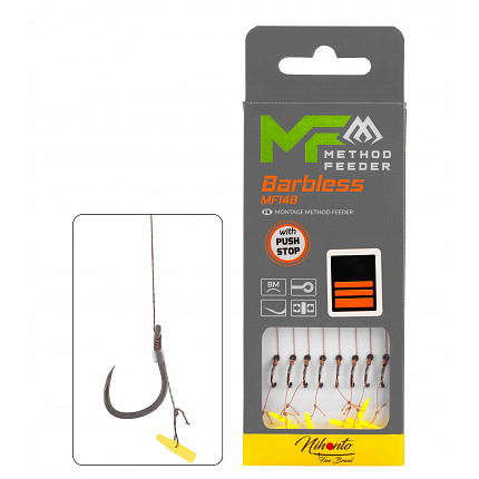 Hotové method návazce na háčcích MF14 bez protihrotu. Extrémně ostré, pevné, s koncem Push Stop, gumička nebo trn. Na pletené šňůře i monofil....