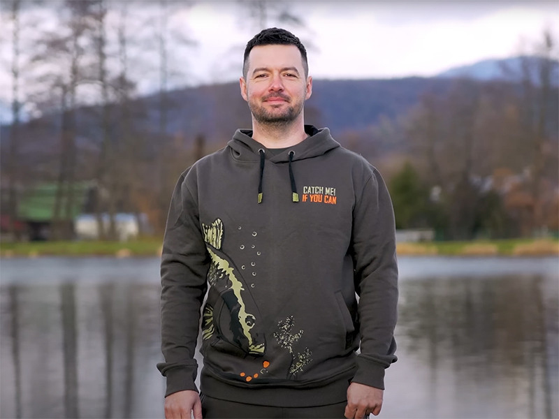 Malba kapra prochází kolem dokola celého trupu v jeho spodní části. Kapr je zobrazen jako skica či malba při zachování všech důležitých detailů. Ryba je zachycena v situaci, kdy se blíží k hrsti boilies, což je právě ten moment, na který všichni na břehu čekáme. Mikina je designována do tmavě zelené barvy s efektní oranžovou a světle zelenou grafikou.