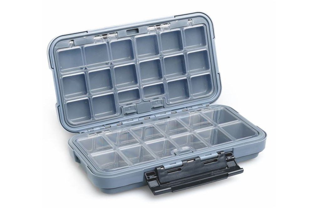 Krabička na háčky a ostatní rybářskou bižuterii. Je pevná a snadno se otvírá, proto nehrozí, že se vám věci rozsypou. Díky speciální přepážce je také zamezeno přesýpání mezi jednotlivými segmenty. Skvěle se hodí na skladováni umělých mušek.