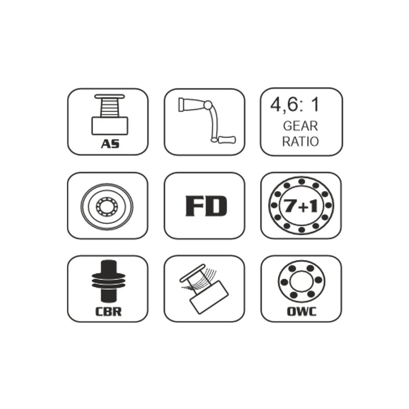 Díky sedmi kuličkovým ložiskům a jednomu válečkovému ložisku pracuje naviják mimořádně hladce. Přední brzda je citlivá a přesná. Hliníková cívka je připravena na dlouhé souboje i časté nahazování.