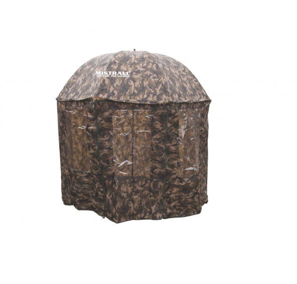 Rybářský deštník z materiálu 210D, vodní sloupec 3000 mm. Vybaven nastavitelným vrchlíkem, díky kterému lze změnit úhel sklonu až o 45 stupňů. Deštník má zástěnu, ve které se nacházejí 3 okna. Maskáčový vzor je u vody nenápadnější a dodává pocit lepšího splynutí s přírodou.