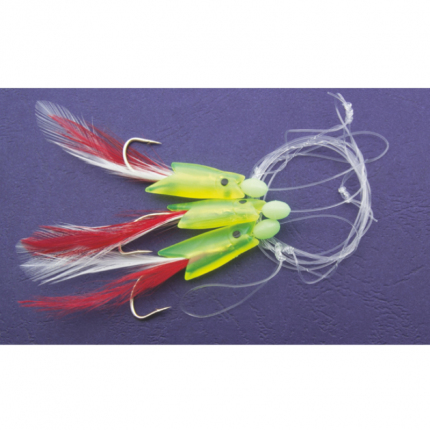 Treskové systémy jsou osazeny třemi nebo čtyřmi háčky podle konkrétního vzoru. Vlasec má průměr 0,6 mm nebo 0,7 mm. Přívěsky svým vzhledem připomínají přirozenou potravu tresky, jsou k dispozici v různých barvách a provedeních. Každý přívěsek je doplněn o zelené korálky. Průměr vlasce: 0,60 mm Velikost háčku: 3/0 ...