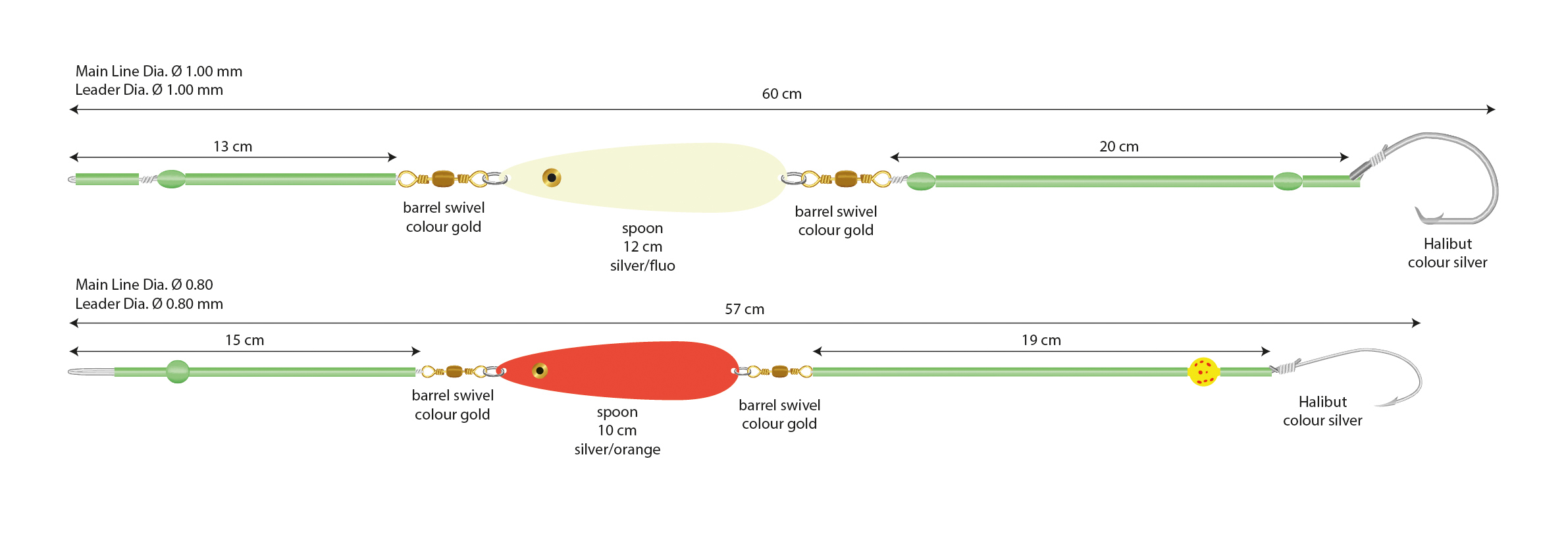 Kompletní set pro lov se "Sea-boom", který udržuje správnou vzdálenost mezi sestavou a zátěží. Ideální pro lov mníka mořského a bělolemého na filety a mrtvou rybu. Obsahuje vábící třpytku, která přitahuje krmící se ryby a vyvolává jejich záběr.