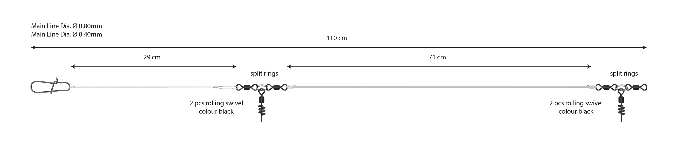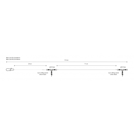 Základní lehká montáž pro lov většiny ryb, postavená na hlavním vlasci 0,8 mm a návazci 0,4 mm. Univerzální systém pro různé nástrahy, vhodný na hloubkách 5 - 50 m. Cílové ryby: treska, mník, polak....