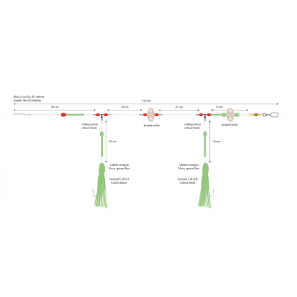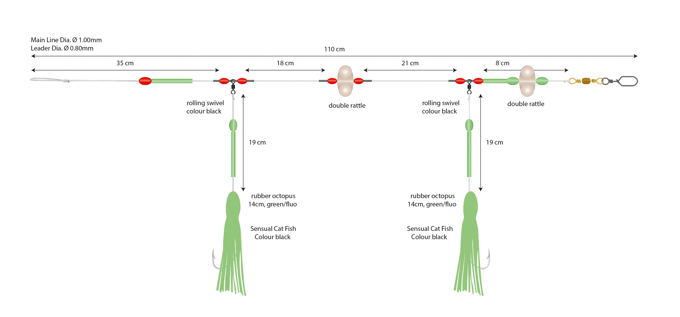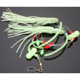 Montáž pro lov norského vlkouše (kočky) s fluorescentní chobotnicí a rolničkou pro snadné nalezení nástrahy. Vhodná pro filety a lov s velkou zátěží na hloubkách 50-100 m. Ideální pro "kočky" a velké mníky.