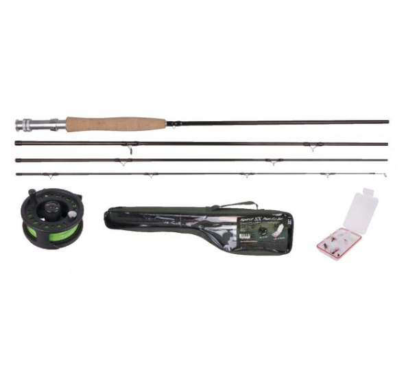 Muškařský set. Obsahuje muškařský prut AFTMA 5-6, naviják se šňůrou fluorozelené barvy a praktickou krabičkou sněkolika muškami. Zahrnuje: