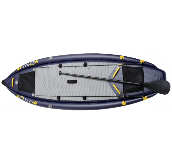 Obsahuje jednu hlavní nafukovací komoru ze silnostěnného dvouvrstvého materiálu potaženého PVC pro optimální pevnost s jedním bezpečnostním ventilem a protiskluzovým povrchem z EVA pěny o tloušťce 5 mm. Dále má dva nezávislé boční plováky, každý s bezpečnostním ventilem. Dvě sítě (jedna vpředu a jedna vzadu) slouží k přepravě tašek, nástrah a vybavení. Obsahuje také 10 D kroužků z odolné nerezové oceli pro libovolné uchycení výbavy. Na palubě jsou dále dva uchycovací pásky pro upevnění prutů nebo pádla. Stabilitě na vodě pomáhají dvě malé ploutve a jedna větší odnímatelná ploutev na spodní straně.