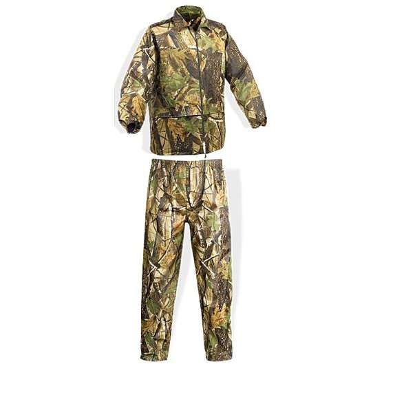 Nepromokavý komplet uložený ve skladné tašce, určený pro splynutí s okolím za deštivého počasí, v límci je integrovaná nepromokavá kapuce.