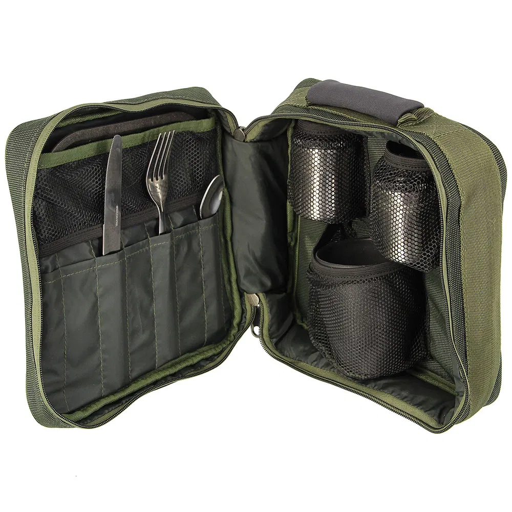 Set obsahuje vše, co potřebujete pro pohodlné stolování během rybářské nebo kempingové výpravy.