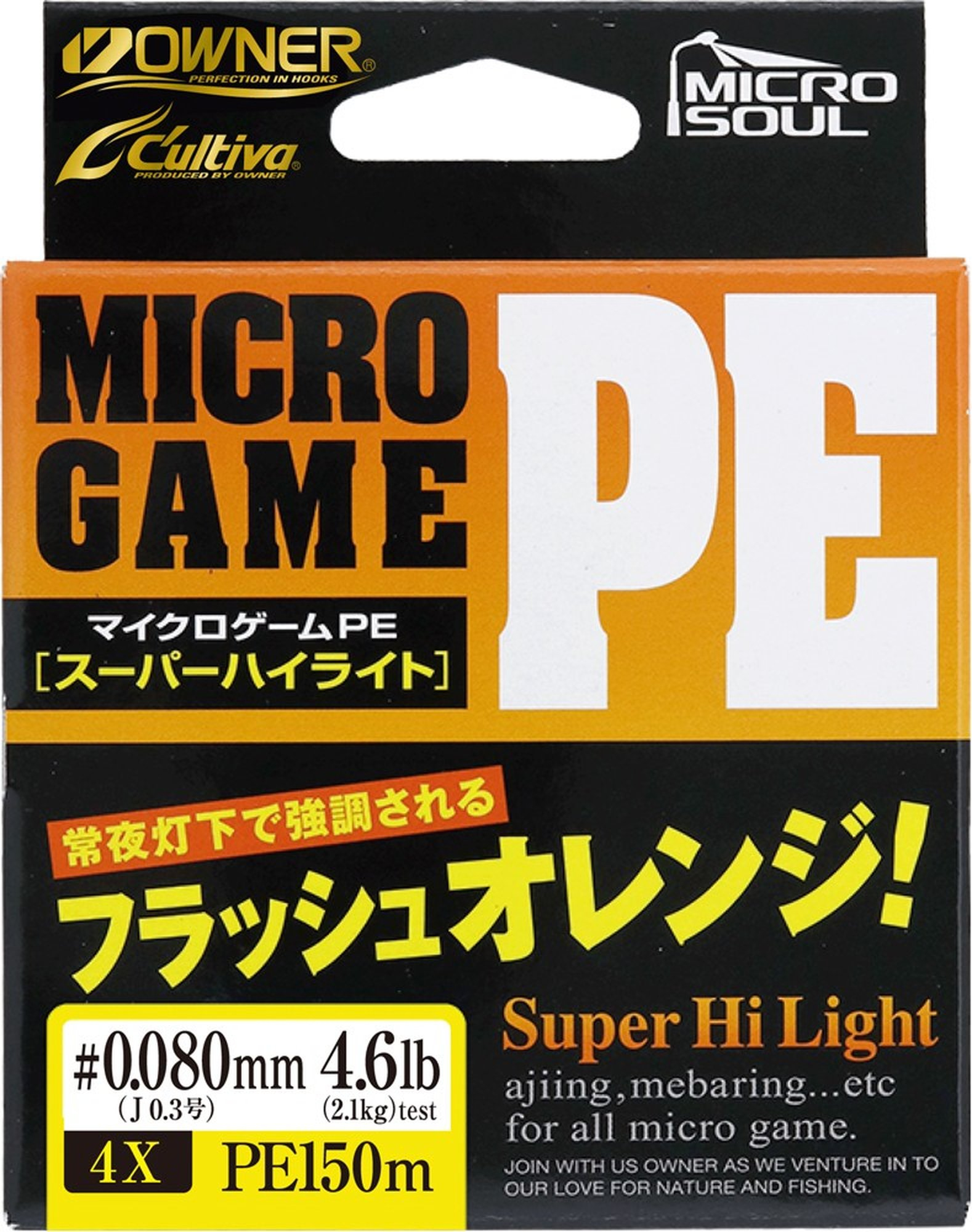 Celý popisOWNER MICRO GAME PE Super Highlight je špičková čtyřpramenná pletená šňůra určená pro ultralehkou přívlač.~Vyvinuta byla pro rybáře, kteří chtějí maximální citlivost, přesnost a kontrolu nástrahy i při nejjemnějších záběrech.~~Díky výrazné barvě Flash Orange je šňůra skvěle viditelná za šera, při lovu proti světlu nebo v odrazu hladiny.~Snadno tak poznáte každý dotek ryby i jemný pohyb nástrahy.~~Čtyřnásobné pletení zajišťuje vysokou odolnost proti oděru, minimální průtažnost a dlouhou životnost.~Perfektní volba pro lov okounů, pstruhů, tloušťů nebo candátů s lehkými nástrahami.~~Hlavní vlastnosti:~Průměr a nosnost: 0.065 mm / 1.4 kg~Vysoce viditelná barva Flash Orange pro lepší kontrolu záběru~4× pletená konstrukce s hladkým povrchem~Nízký průtah a maximální citlivost~Výborná odolnost vůči oděru~Vhodná pro ultralehkou přívlač (UL, light spinning)~Délka návinu: 150 m~~Vyrobeno v Japonsku ~~Dostupné průměry a nosnosti:~0.05 mm / 1.1 kg~0.065 mm / 1.4 kg~0.08 mm / 2.1 kg~0.09 mm / 2.8 kg~0.095 mm / 3.5 kg