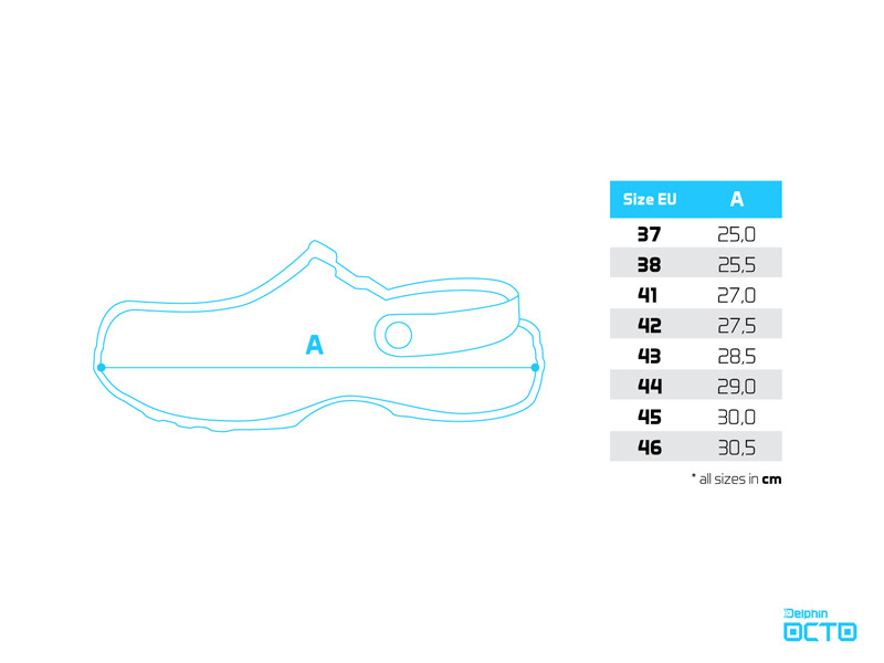 Dalším sofistikovaným prvkem jsou velké postranní otvory, jejichž prioritním úkolem je starat se o odvětrávání a celkovou vzdušnost v této obuvi. Záměrně nejsou navrženy ve výši podrážky, jak to bývá standardem, ale o něco výše. Právě tento detail hraje významnou roli během pobytu na břehu, či mělké vodě. Tím, že otvory jsou o něco vyšší nad vnitřní stélkou je téměř eliminováno nechtěné nabírání písku či kamínků mezi podrážku a chodilo. Vaše chodidla jsou tedy chráněny v maximální možné míře. Kromě těchto otvorů slouží k odvětrávání hustá perforace umístěna ve vrchní části. Ta je záměrně vytvarována na jedné straně do symbolu D z loga Delphin, na druhé vsuvce zase kraluje symbol O, jako počáteční písmeno názvu OCTO. Celkový dojem ještě zhodnocuje jemná struktura na povrchu pantoflí, která evokuje kůži chobotnice. Díky použitému EVA materiálu jsou mimořádně lehké, houževnaté a dokonce plovoucí. Samozřejmostí je u tohoto modelu poutko na fixaci paty (lidově nazývané i uzávěrka), které oceníte zejména v nerovné, či svahovitejšom terénu.