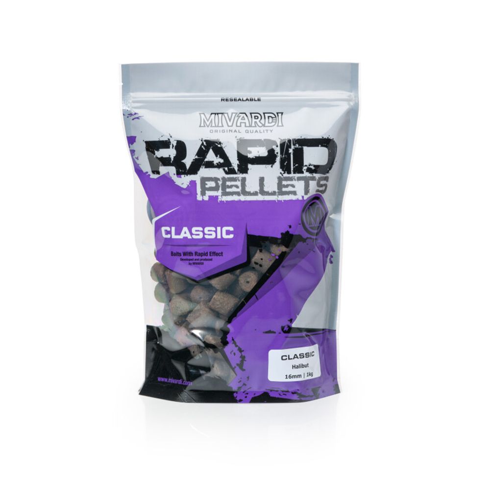 Pelety Mivardi Rapid Classic Halibut- Populární "olejové" pelety v příchutích Halibut dostupné v široké nabídce průměrů. Všechny průměry kromě 4mm jsou dodávány s dírkou a umožňují tedy snadné nastražení. Jejich výroba probíhá na naší vlastní výrobní lince z kvalitních ingrediencí, používaných pro výrobu boilies.