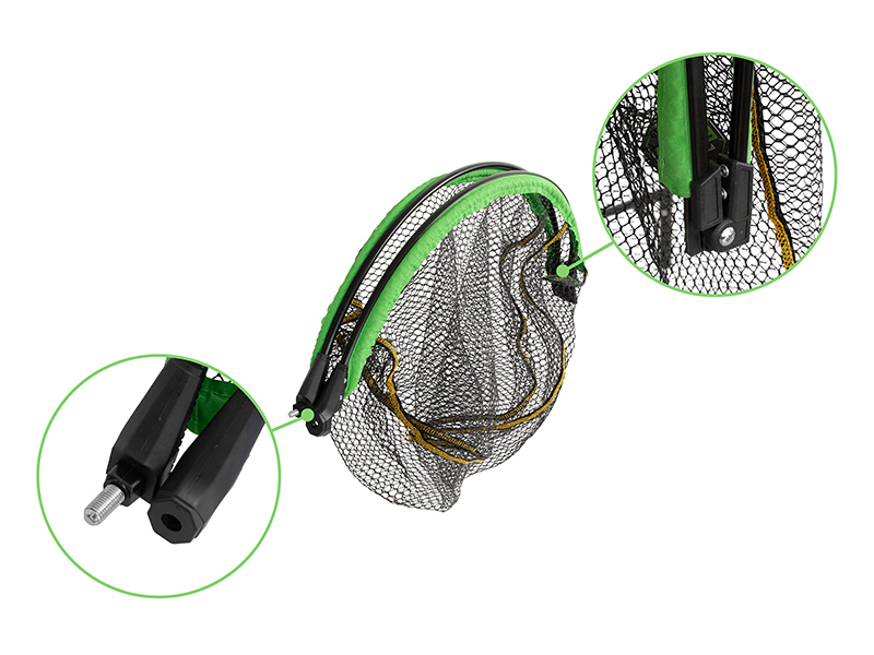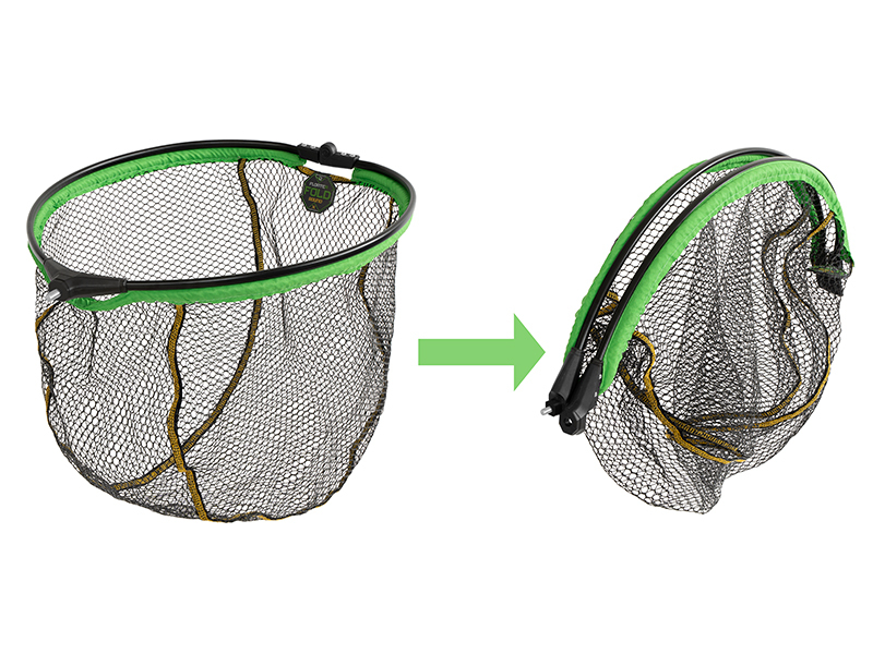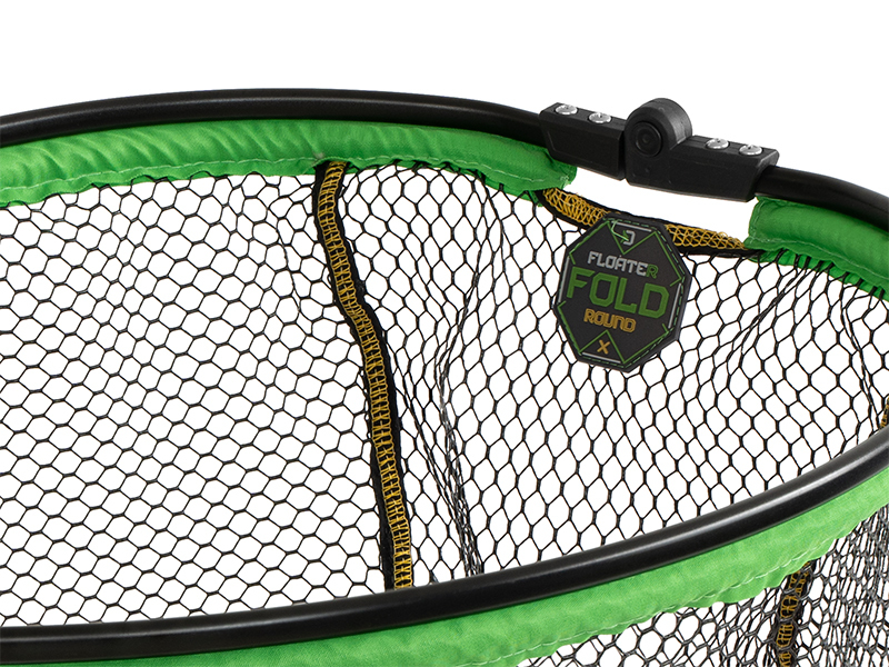 Síťka FloateR FoldROUND je celá pogumovaná, tím pádem nenasává okolní vodu, snadno a rychle na vzduchu vysychá. Pod rámem je navíc prošita výraznou zelenou látkou po celém obvodu pro zvýšení pevnosti a odolnosti. Jelikož hlava plave na hladině, můžete si ji pohodlně položit na vodu než se vám podaří rybu vyčerpat a navést k podběráku. Designově je laděna do černo-zelené barvy a tím skvěle doplňuje feederovou řadu produktů REAXE. Rám této hlavy je navíc skládatelný na polovinu a tím pádem zabere ve vaší výbavě méně místa než standardní podběrákové hlavy. Hlava se ideálně hodí pro kombinaci s rukojeťmi REAXE, ale díky univerzálnímu závitu je vhodná pro většinu prodávaných rukojetí na trhu.