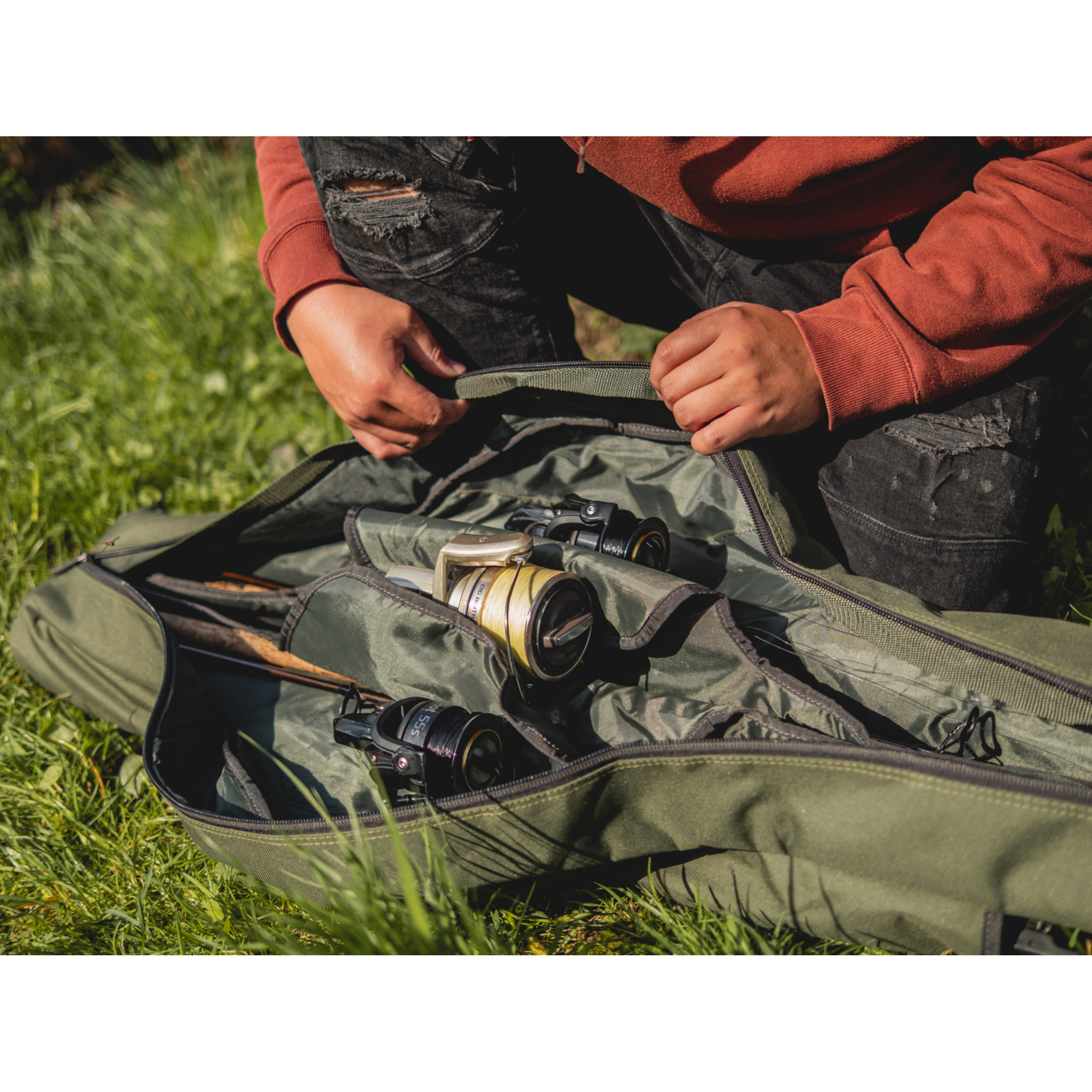 Pouzdro na pruty Wychwood Comforter Multi Rod Sleeves bylo navrženo pro bezpečnou ochranu, uskladnění a jednoduchý transport. Díky jeho uspořádání je možné uskladnit do hlavní komory až 3 pruty společně s navijáky. Po stranách nalezneme boční kapsy pro další pruty nebo jiné doplňky jako jsou podběráky apod. Specifikace: - silné klipsny a popruhy - plně polstrované pro maximální ochranu - externí zipy a popruhy - použitý materiál nylon 600D - polstrovaný ramenní popruh - kapsy pro olova - barva: zelená