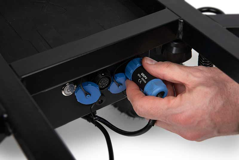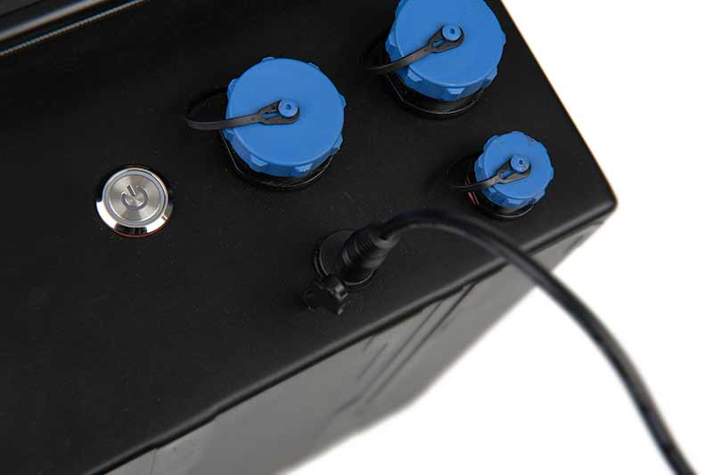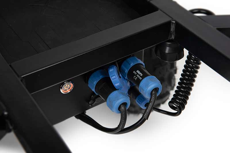 - Napájení pohonu kol zajišťuje napájecí skříňka s nabíjecím portem a vypínačem.