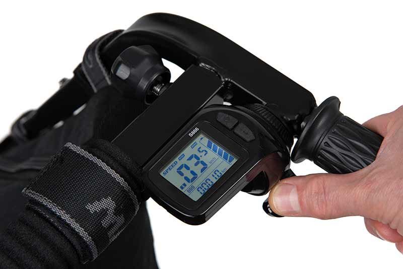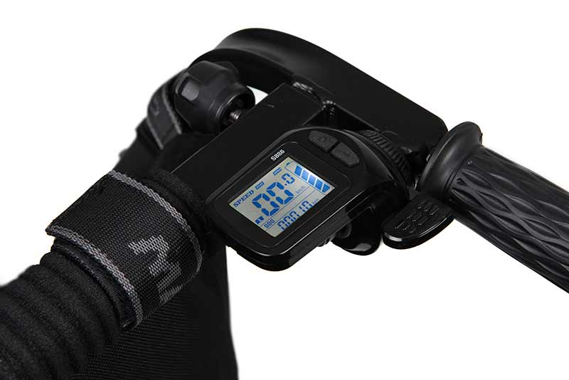 - Zobrazovací panel ukazuje rychlost, ujetou vzdálenost a stav baterie