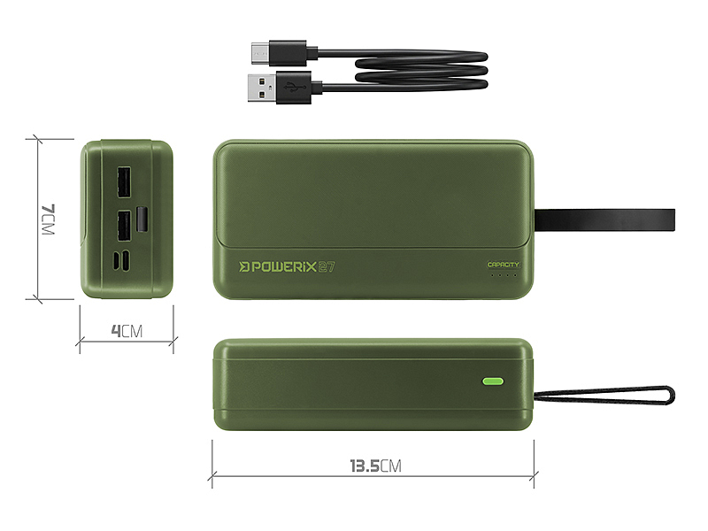 Konstrukce powerbanky je navržena s ohledem na praktické využití v terénu a vysokou odolnost. Robustní tělo doplňuje integrované poutko, které umožňuje bezpečné zavěšení zařízení například na háček v bivaku. S modelem POWERIX získáváte jistotu, že vaše výbava bude mít dostatek energie po celou dobu lovu.