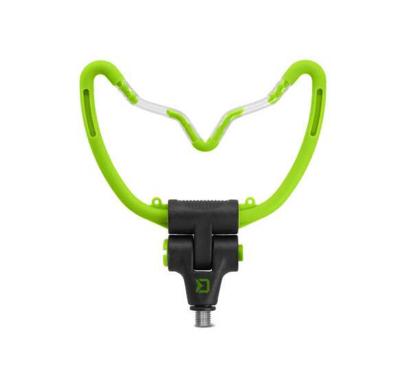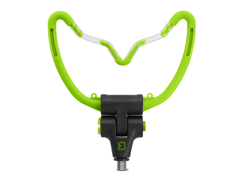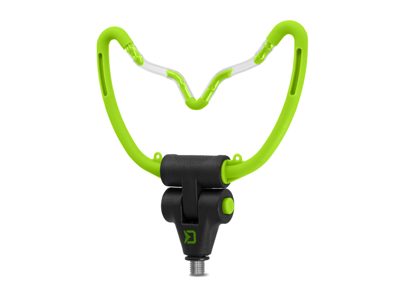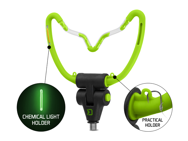Tvar V zajišťuje plynulý chod vlasce během záběru. Díky důmyslnému systému tlačítka ve spodní části, lze tento držák polohovat a následně polohu zajistit. Šířka ramen je 14,5cm. Užitečným doplňkem držáku jsou očka pro uchycení háčku, do kterých můžete zachytit háček například při plnění feederového košíku. Držák má na těle umístěny 4 otvory pro chemické světlo, což oceníte zejména při nočním rybolovu. Držák je osazen univerzálním závitem a je kompatibilní s většinou vidliček a stojanů dostupných na trhu.