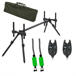 Kompaktní a velmi univerzální stojan na 2 pruty, který pokryje prakticky všechny rybářské situace. Základem je lehký, kompletně nastavitelný rám s nasta- vitelnými nohami, které se dají nastavit jak v délce, tak i v úhlu, který svírají s rámem. Díky tomu je možné umístit špičky prutů velmi vysoko směrem o obloze i velmi nízko směrem k zemi.