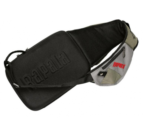 Rapala Sling Bag 46006 - Revoluční brašna pro mobilní rybáře. Brašnu přehodíte na prsa, otevřete a tak vytvoříte velice dobře přístupný zavěšený pracovní stolek. 2 hlavní přihrádky s dvojitým zipem obsahují krabičky Plano 3600. Na vypolstrovaném ramenním popruhu: vytahovací šňůrka k upevnění rybářské pomůcky, D-kroužek, vzadu kapsa na zip a na přední straně kapsa pro kleště. Rozměry tašky jsou: 31 cm x 23 cm x 11 cm