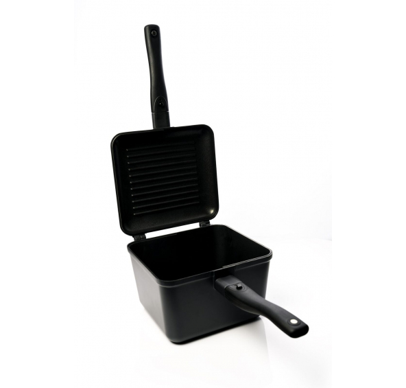 Připravit, ke startu a vařit! Vrhněte se naplno do kulinářského dobrodružství s víceúčelovou sadou Connect Multi-Purpose and Griddle Set. Pomocí této sady skládající se z hluboké pánve a mělké grilovací pánve můžete popustit uzdu své kulinářské fantazii a zažít nezapomenutelné chuťové zážitky! Díky inovativní konstrukci odnímatelné rukojeti lze grilovací pánev použít jako víko pro hlubokou pánev nebo použít oba pánve samostatně, záleží jen na vás. Špičkový fluoropolymerový povrch poskytuje bezkonkurenční nepřilnavé vlastnosti a hranatý tvar a odnímatelné držadla umožňují snadné skladování v jakékoliv situaci. Kromě toho jsou hluboká pánev i mělká grilovací pánev plně kompatibilní s RidgeMonkey Connect Compact Toasterem XL, což vám otevírá množství dalších možností! Specifikace: • Lehké tlakově lité hliníkové pánve • Fluorpolymerový nelepivý povrch • Zesílená vnější konstrukce pro rovnoměrný přenos tepla • Vyjímatelné rukojeti s magnetickým zámkem • Unikátní odnímatelný design rukojetí • Plně kompatibilní s RidgeMonkey Connect Compact Toasterem XL • Lze použít na všech tradičních vařičích a přímých zdrojích tepla (nevhodné pro indukční varné desky) • Chráněný registrovaný design • Rozměry: 23,5 (35 i s držadlem) x 20,5 x 13,5cm