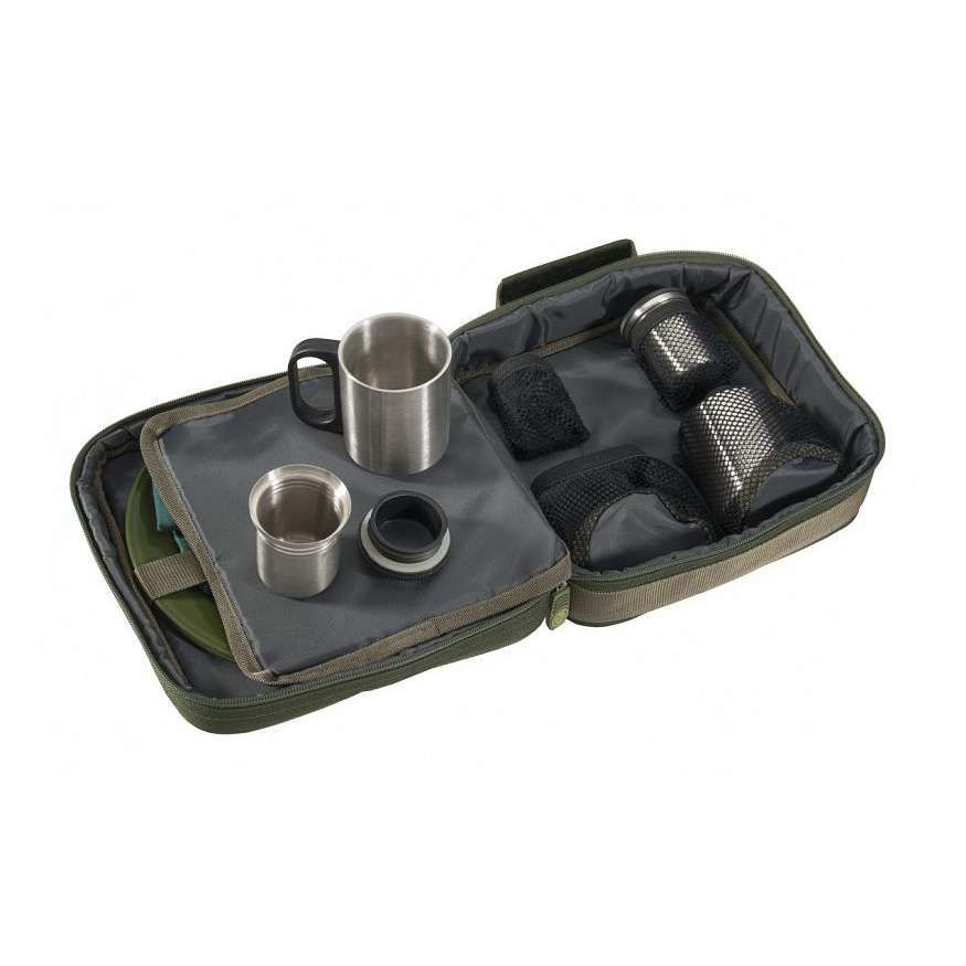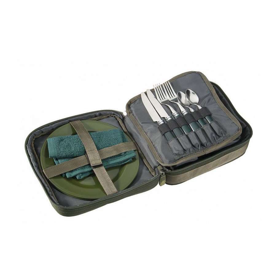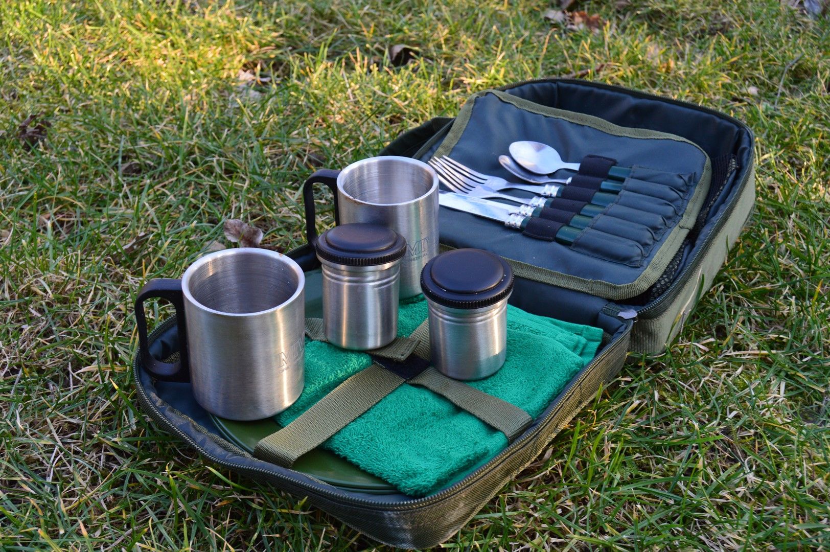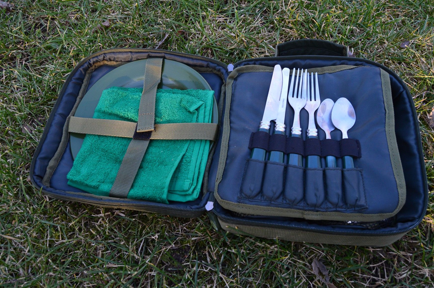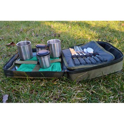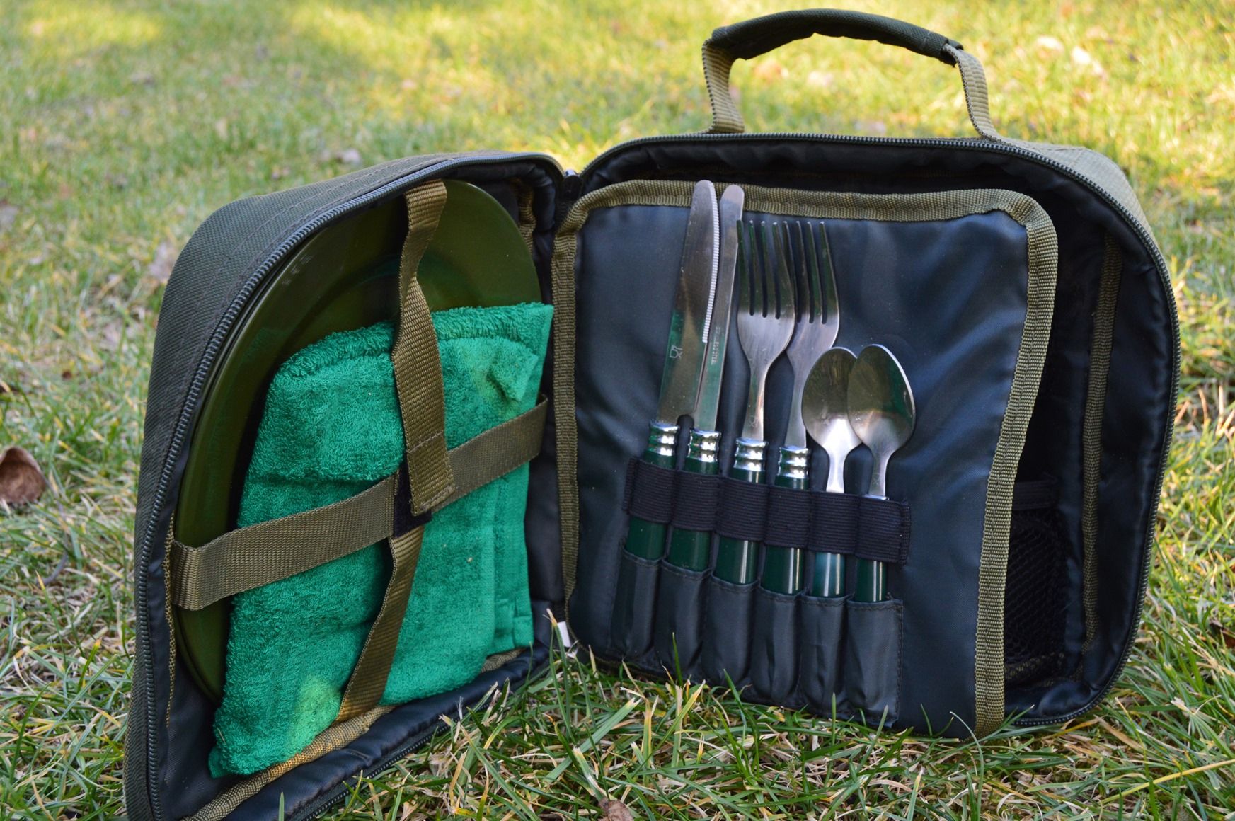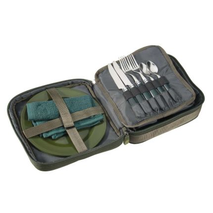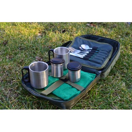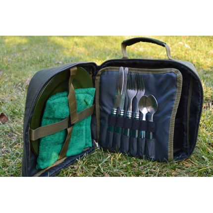 Sada kvalitního jídelního příslušenství. Obsahuje froté utěrku, talíře z velmi odolného plastu, kompletní příbory, nerezové termohrnky a nerezové dózy na cukr a sůl s kvalitním těsněním. Vše je zabaleno v kvalitním polstrovaném pouzdru se zipem a transportním uchem.
